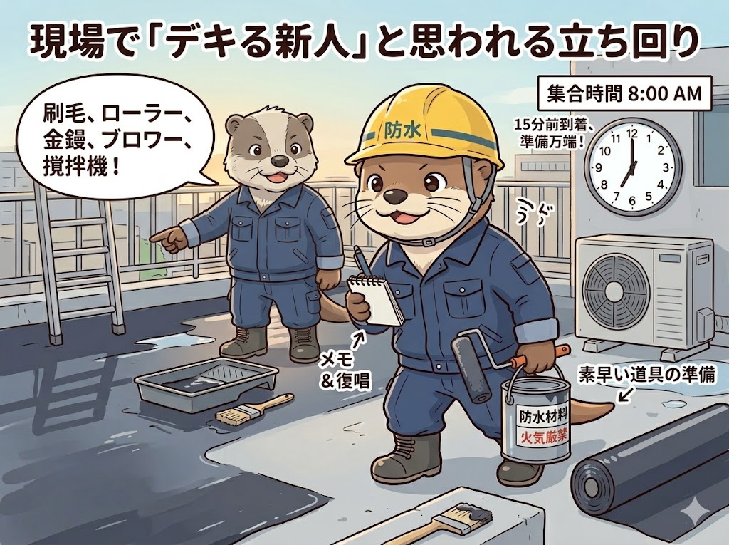 本記事では、防水業界の新人さんが入社初日に押さえておくべき挨拶の基本から、現場での振る舞い、安全管理のルールまでを分かりやすくまとめました。
