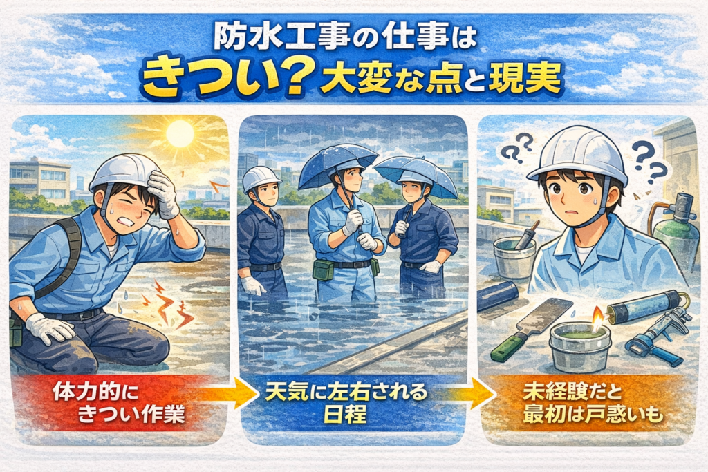 「防水工事って、実際どんな仕事をするの?」「きついって聞くけど、一日の流れは?」「未経験でもやっていける?」