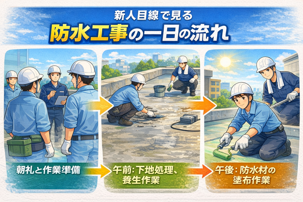 結論から言うと、防水工事は建物を雨や劣化から守る重要な仕事であり、一日の流れや役割を知れば、未経験の新人でも現場の姿がはっきり見えてきます。